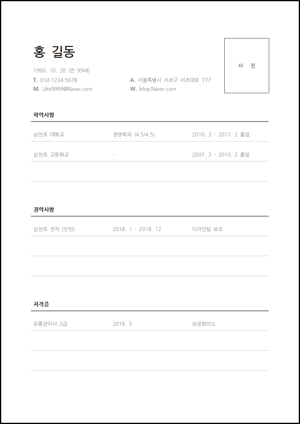 아래는 잡코리에서 다운로드 받은 이력서 양식은 보다 간단하게 변형한 것으로 샘플이미지 하단에 첨부되어 있는 파일을 클릭하면 문서를 다운로드 받을 수 있습니다.