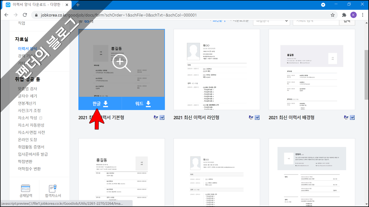 4. 한글 이력서로 이동하면 다양한 버전의 이력서가 표시됩니다. 한글과 워드 두 가지 형식을 제공하고 있으며, 관심있는 이력서로 마우스 커서를 가져가면 아래 그림처럼 다운로드 단추가 나타납니다. 한글은 한컴 오피스 파일 형식이고, 워드는 MS-OFFICE 형식의 파일을 다운로드 받을 수 있습니다.