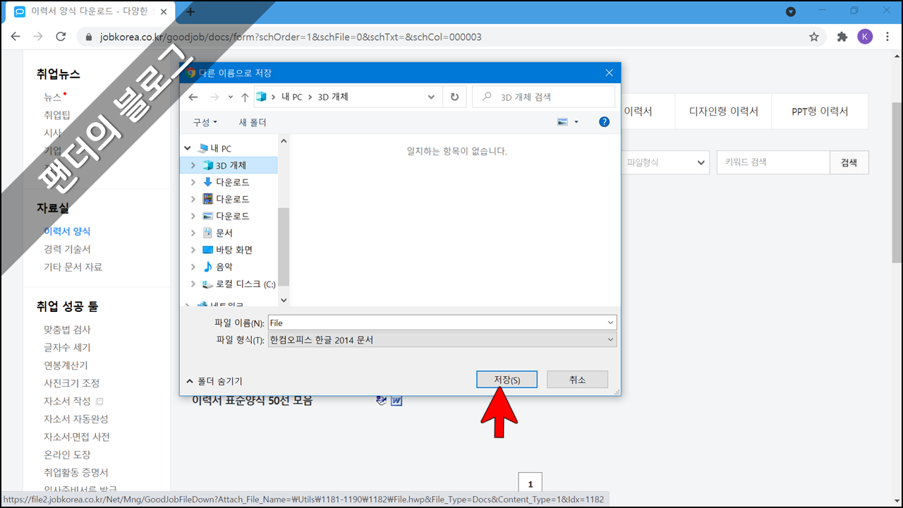 5. 다운로드 받을 파일 형식을 클릭하면 다른 이름으로 저장 창이 열립니다. 문서를 저장할 위치로 이동한 다음 저장을 클릭하면 문서가 컴퓨터로 저장됩니다.