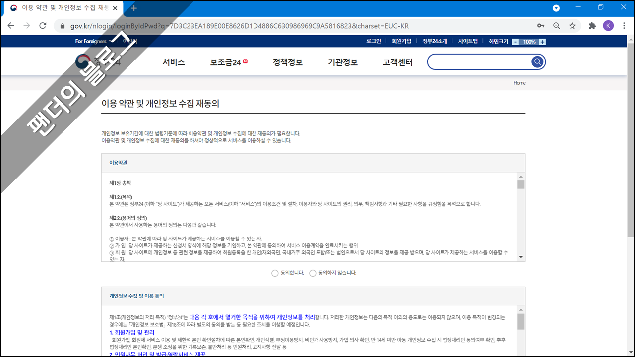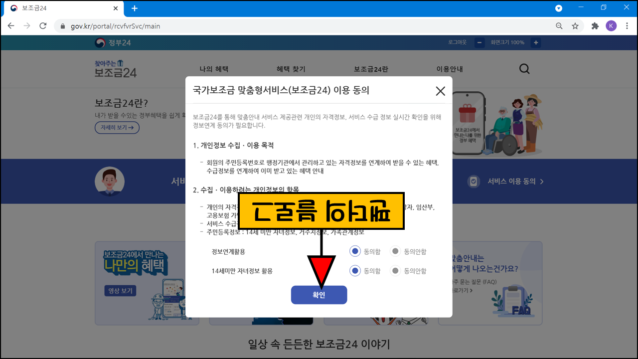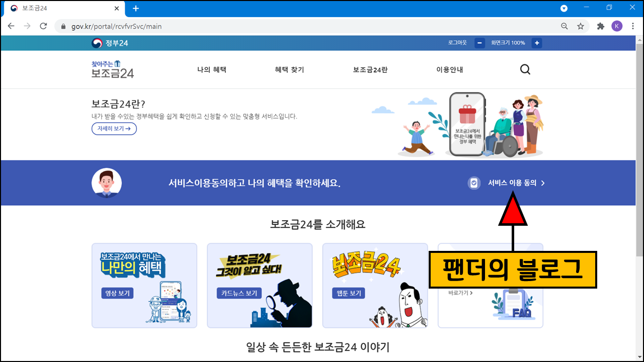아래 그림과 같이 보조금24 기본화면으로 돌아가면 서비스 이용 동의를 클릭합니다.