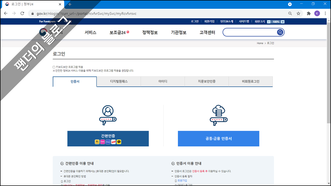 계정이 없는 사람은 사이트 상단에 있는 회원가입 버튼을 클릭하여 계정을 생성하거나 간편인증을 통해서 로그인을 진행합니다. 공동인증서나 과거 금융인증서가 있다면 공동-금융 인증서를 클릭하여 로그인을 진행할 수 있습니다.