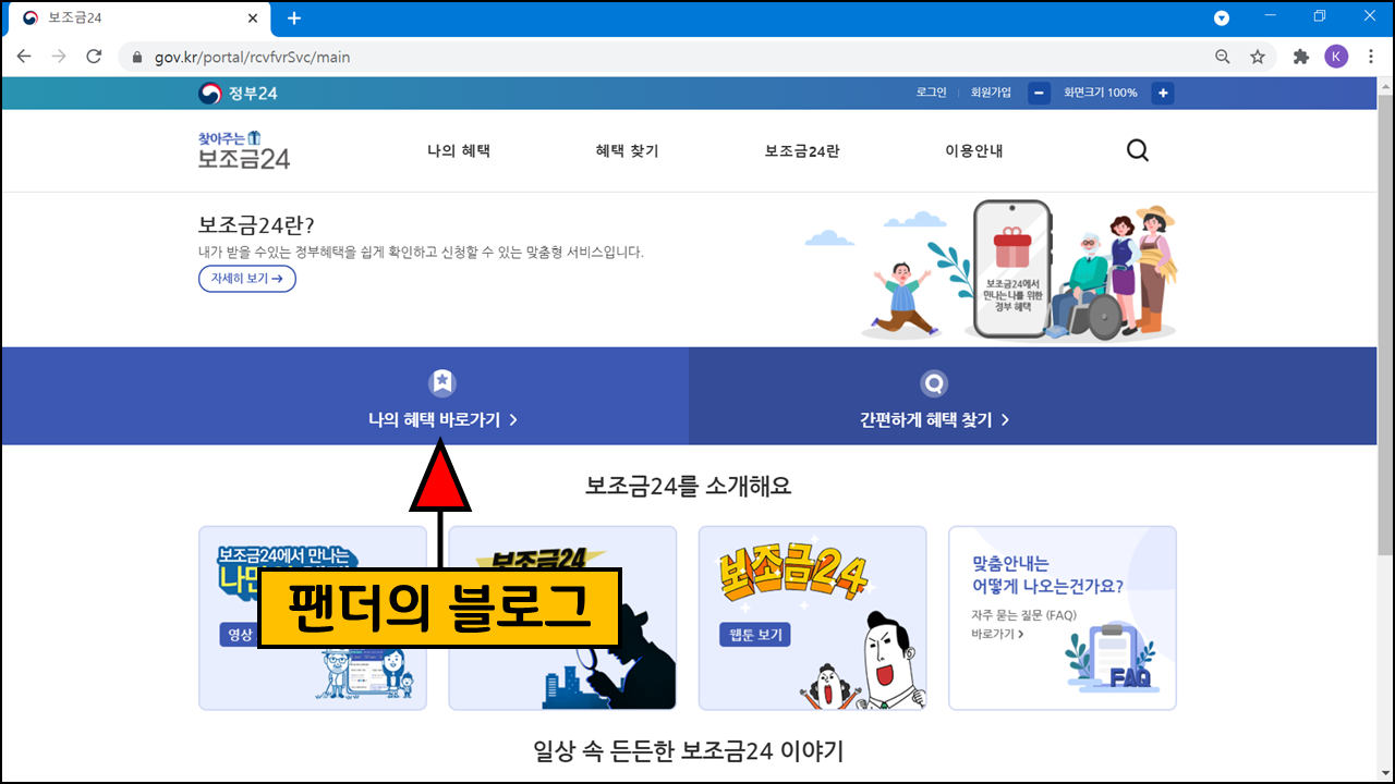 보조금24 메인페이지로 들어가면 두 개의 메뉴가 표시됩니다. 그중 나의 혜택 바로가기를 클릭합니다.