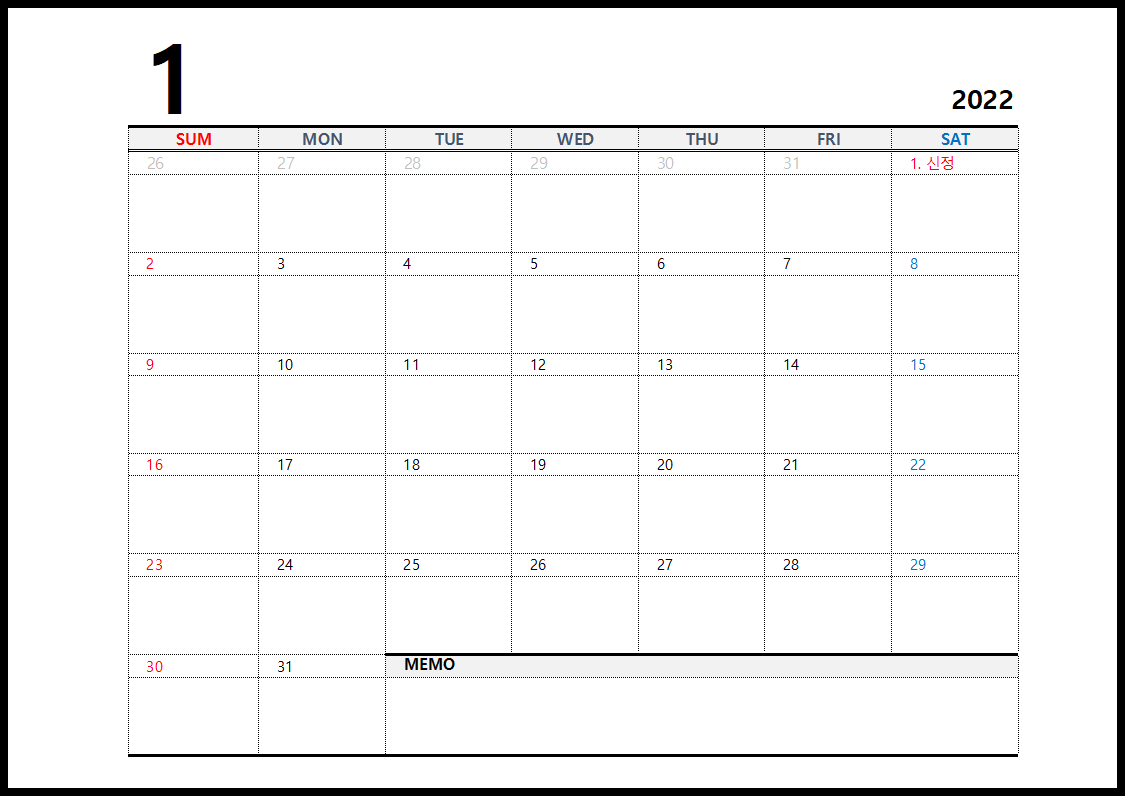가로형 첫 번째 달력에서는 맑은 고딕체를 적용하여 제작하였습니다. 샘플 이미지 하단에 있는 첨부파일을 클릭하면 문서를 다운로드 받을 수 있습니다. 문서에 적용되어 있는 비밀번호는 상단에 있는 문서 비밀번호 페이지에서 확인할 수 있습니다.