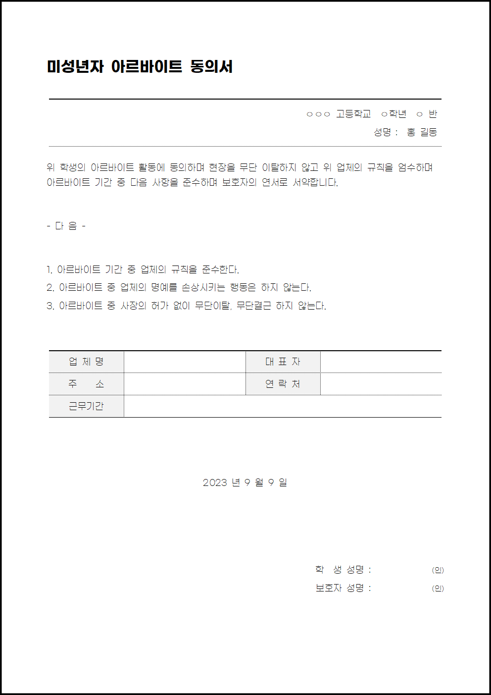 아르바이트 부모님 동의서 양식