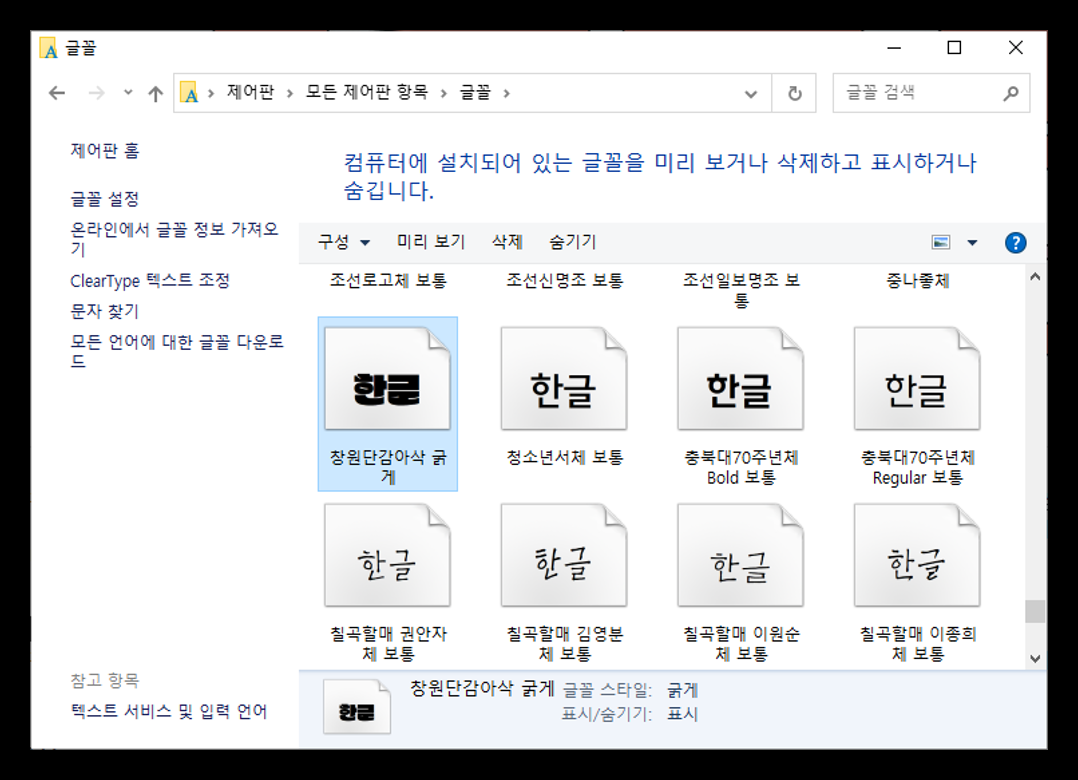 폰트가 정상적으로 설치되었는지는 제어판 - 글꼴을 통해서 확인할 수 있습니다.