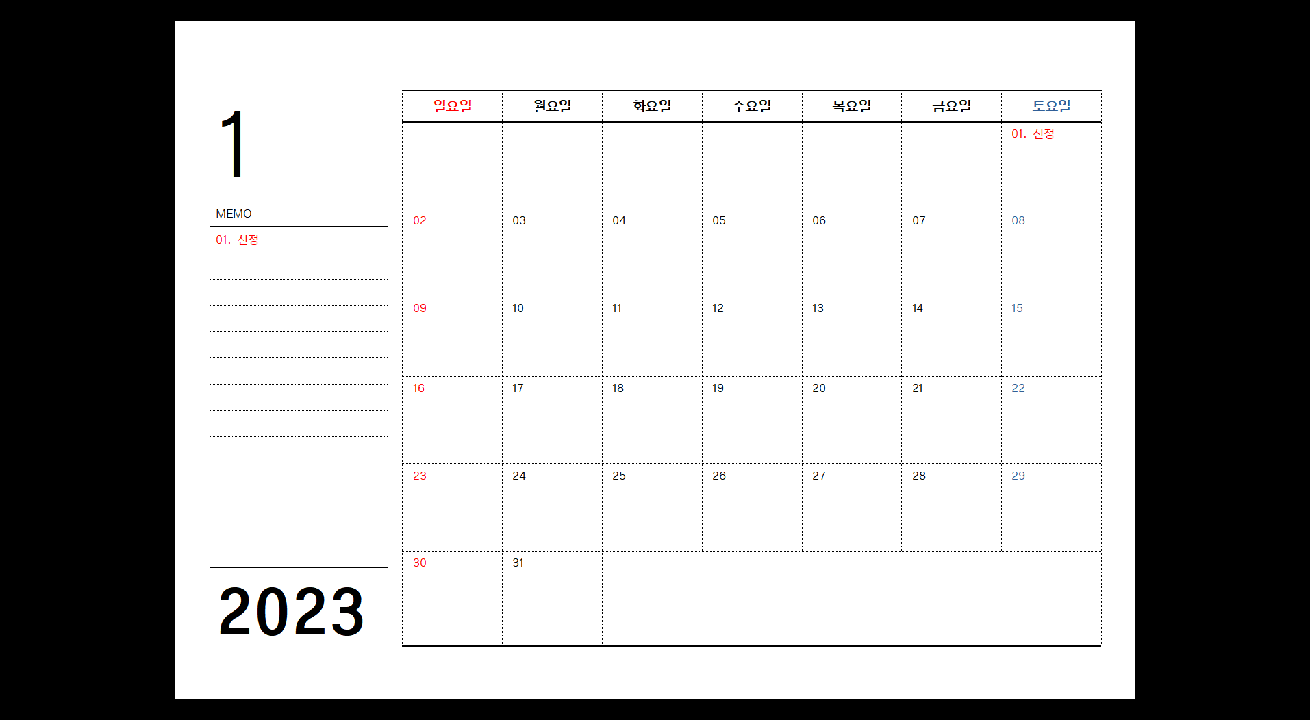 2023년 엑셀 달력 무료 다운로드 : XLSX
