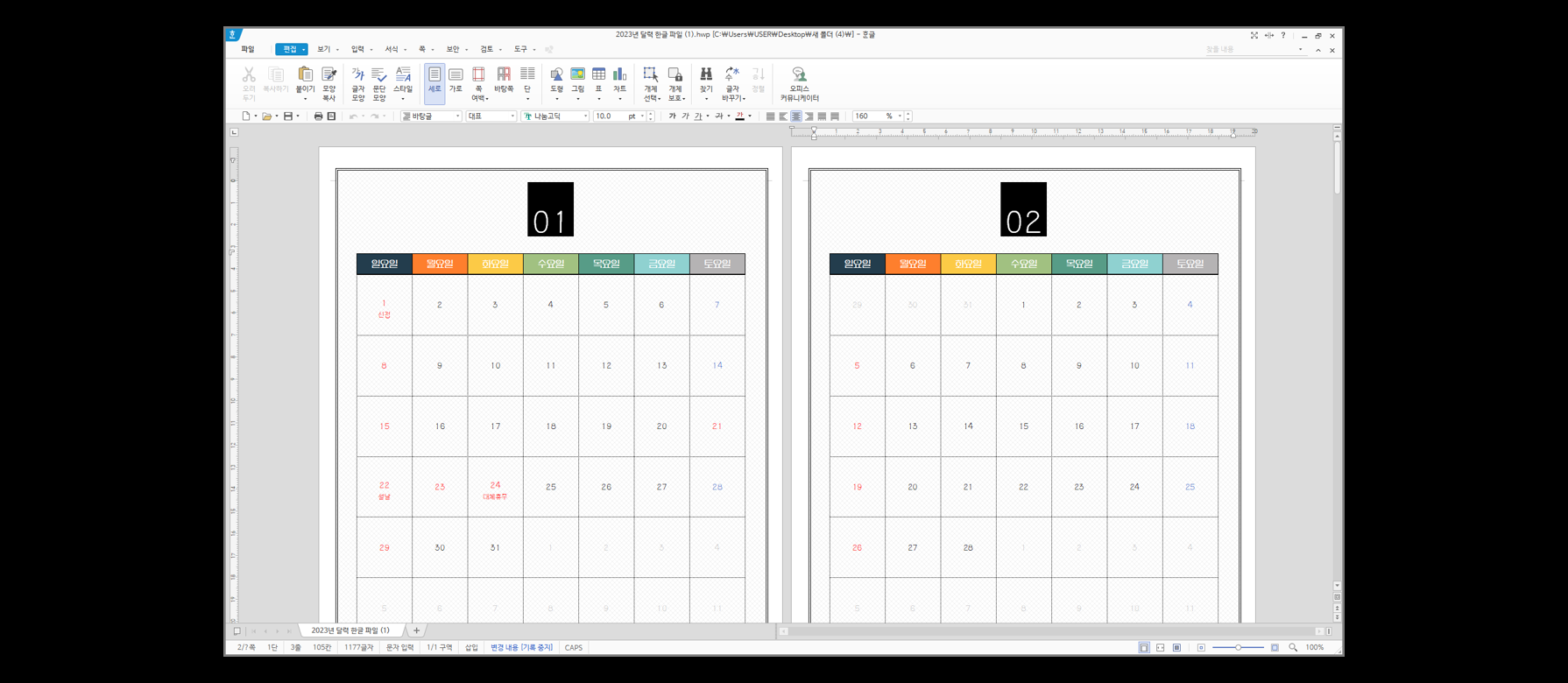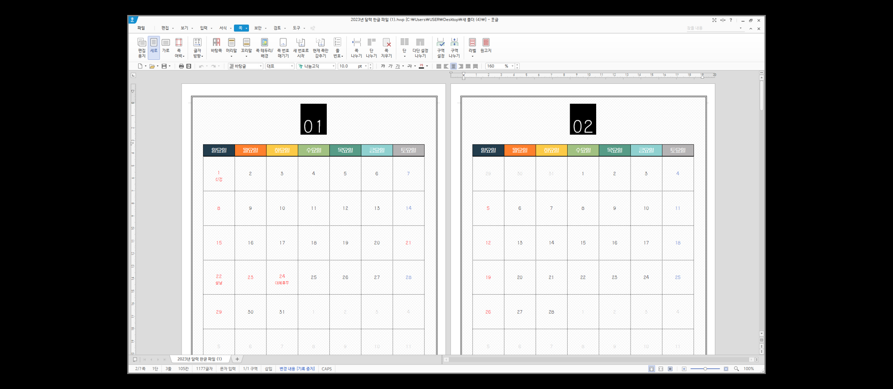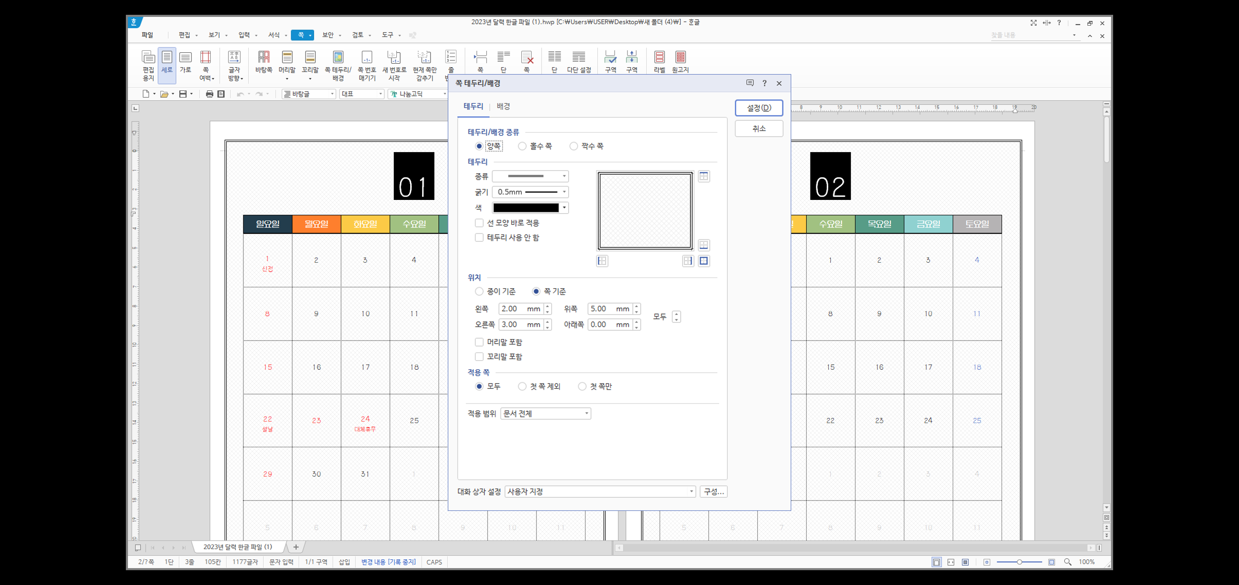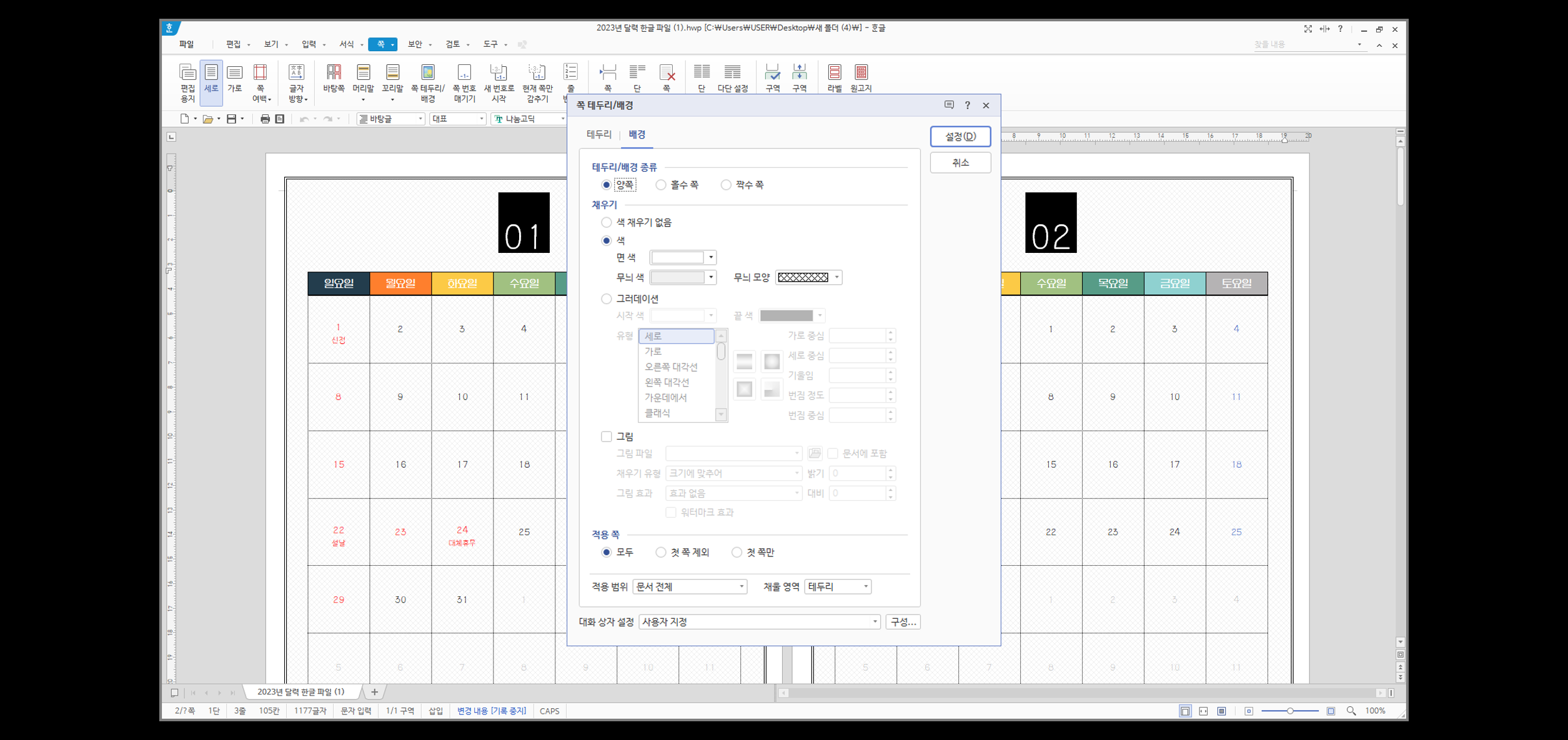 첫 번째 달력에는 배경에 체크무늬가 적용되어 있습니다. 이는 쪽 테두리/배경 설정을 통해서 다른 무늬로 변경하거나 표시되지 않도록 삭제할 수 있습니다.