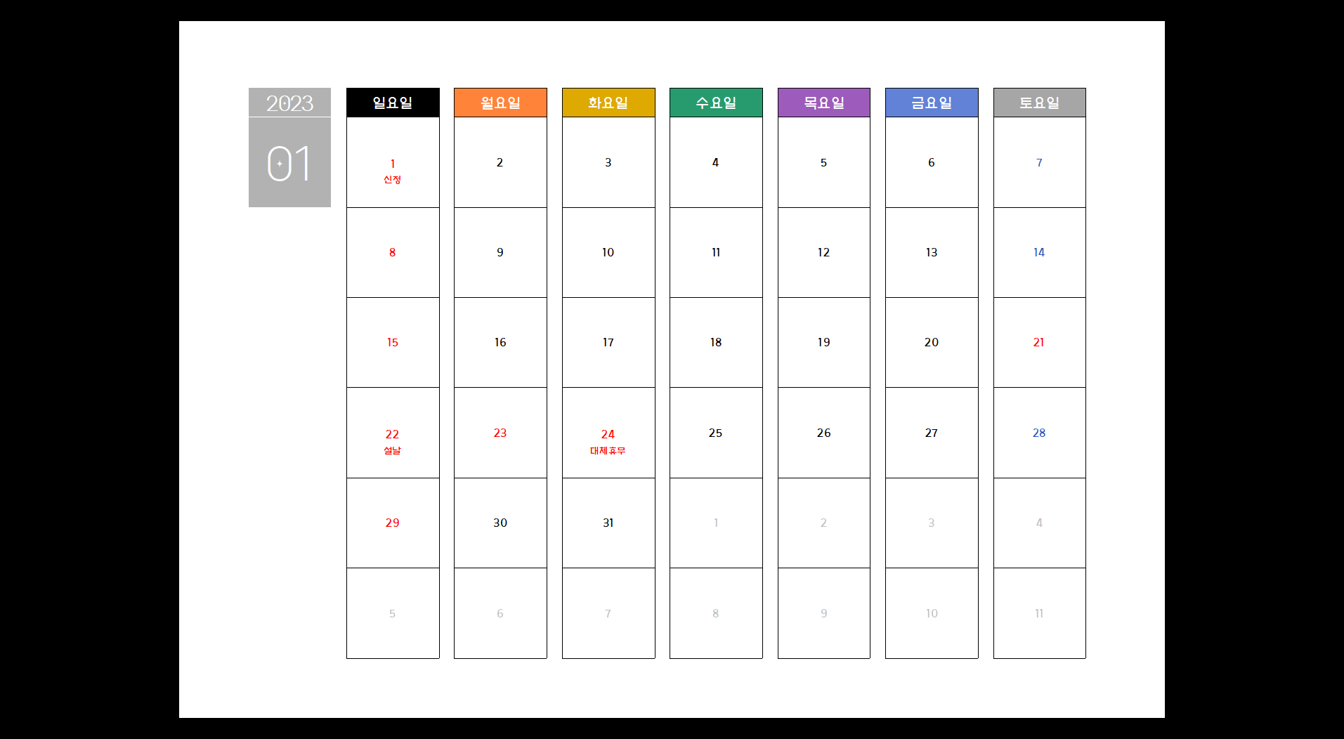 2023년 엑셀 달력 무료 다운로드 : XLSX
