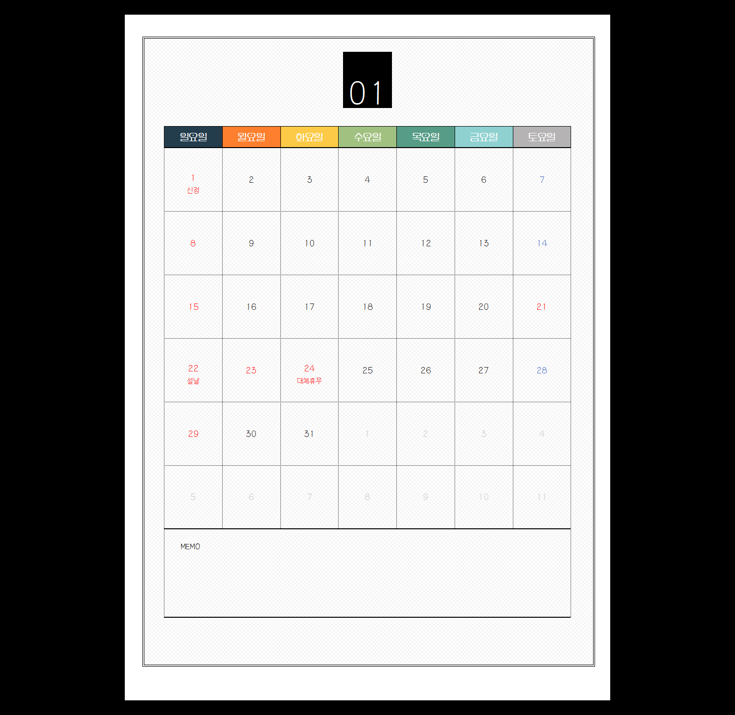 * 01월 : 01일(신정), 21일 ~ 24일(설 연휴)