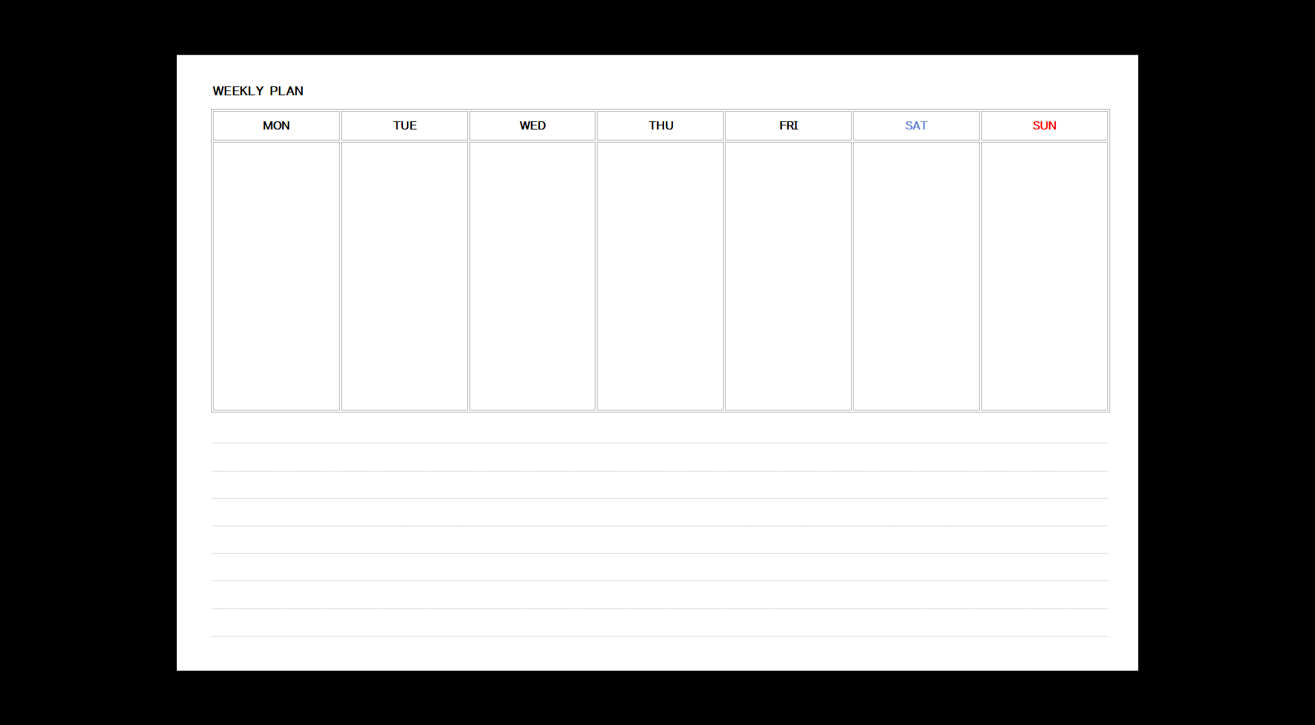 주 단위로 스케줄을 기록하여 관리할 수 있는 주간 일정표 양식입니다. 각 이미지 하단에 첨부되어 있는 파일을 클릭하면 엑셀 버전 또는 한글 버전의 주간 일정표를 다운로드 받을 수 있습니다.