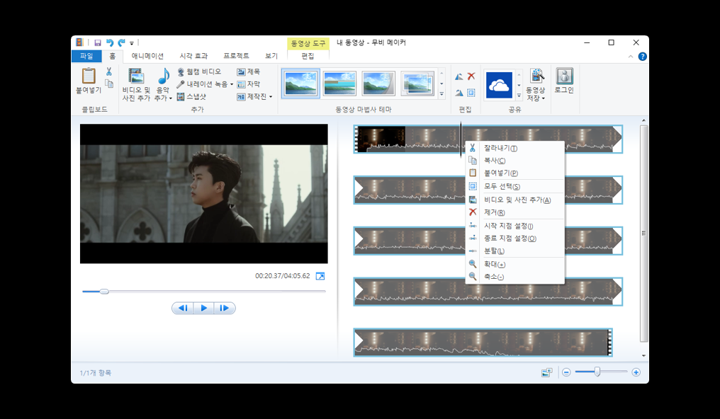 불러온 영상이 오른쪽 사이드 타임라인에 표시되면 전체 재생구간 중 분할위치를 마우스 오른쪽 버튼으로 클릭합니다. 편집메뉴가 표시되면 목록에서 분할(L)을 클릭하여 선택한 위치를 기준으로 영상을 나눌 수 있습니다.