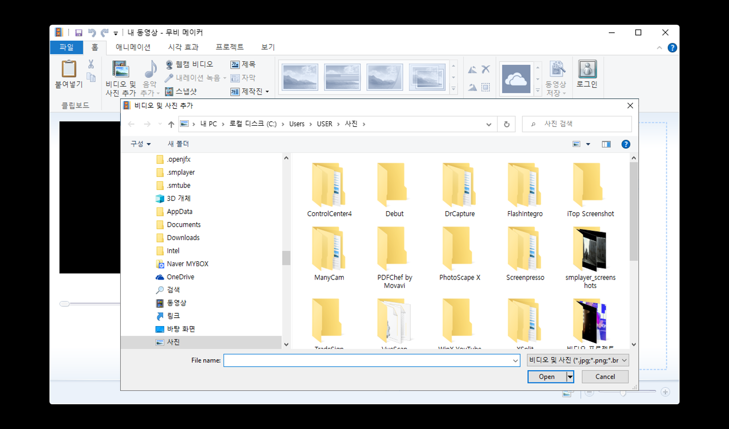 비디오 및 사진 추가 창이 열리면 편집할 동영상 파일을 선택하고 열기를 클릭합니다.