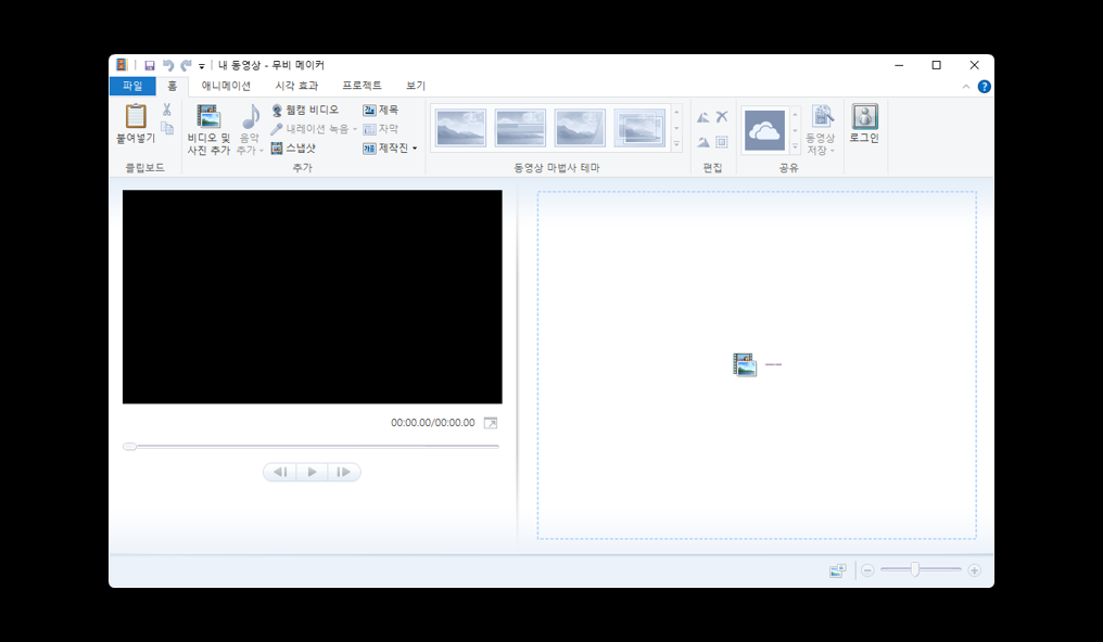 윈도우 무비메이커를 실행한 후 홈 탭의 비디오 및 사진 추가를 클릭합니다. 윈도우 무비메이커가 없다면 여기를 클릭하여 다운로드 받습니다.