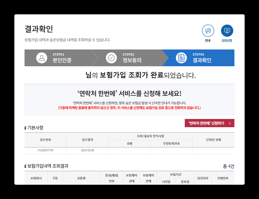 내 개인정보(성명, 주민등록번호)를 이용하여 보험조회결과가 표시되면 하단 보험가입내역 조회결과에 내가 가입되어 있는 모든 보험이 표시됩니다.