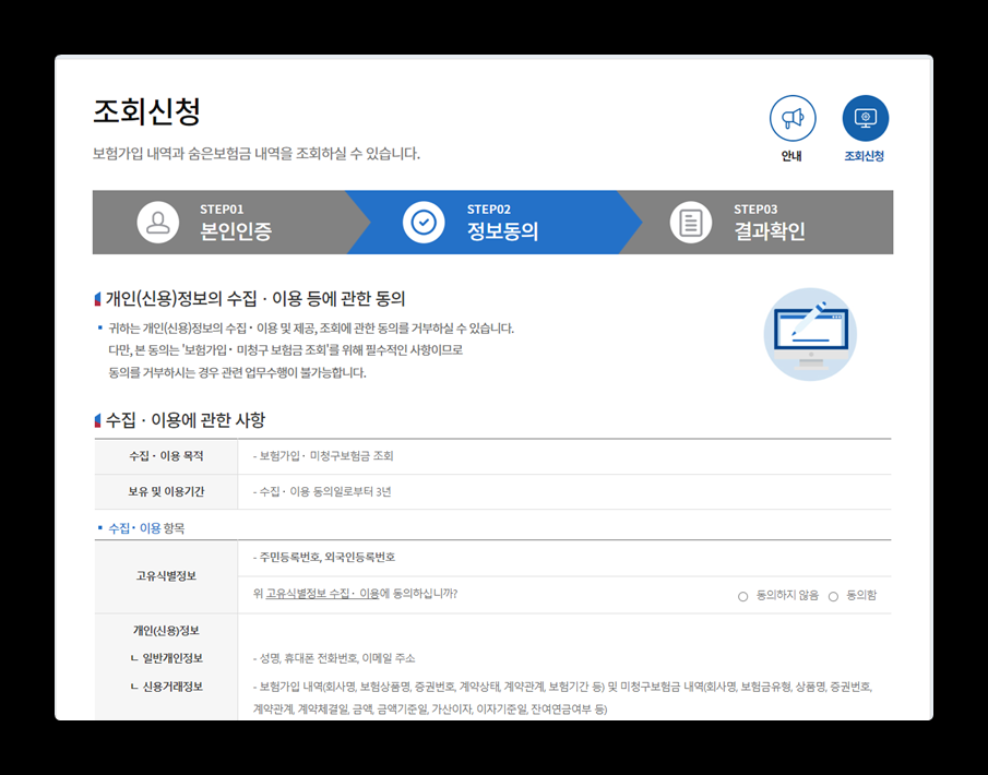 내가 가입한 보험 찾기는 3단계(본인인증 → 정보동의 → 결과확인) 과정을 거쳐 확인할 수 있습니다.