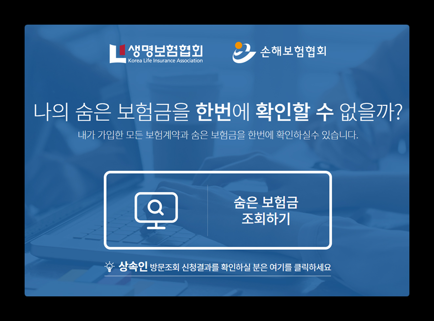 생명보험협회, 손해보험협회에서 공동으로 운영하고 있는 숨은 보험금 찾기 서비스를 이용하면 내가 가입되어 있는 보험을 한번에 검색하여 확인할 수 있습니다. 계정가입&로그인은 필요 없고 공동인증서, 휴대폰 등 본인임을 인증할 수 있는 수단만 있으면 무료로 조회할 수 있습니다.