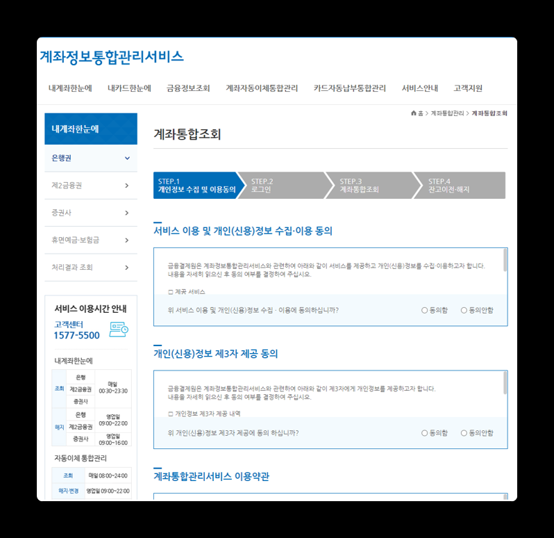①개인정보 수집&이용동의 단계로 이동하면 모든 항목에 동의함을 선택하고 로그인 단계로 이동합니다. → ②로그인 단계로 이동하면 하단에 표시되는 인증도구 중 선호하는 방법을 선택하여 본인확인을 진행하면 은행별 계좌정보가 표시됩니다. → ③비활동성계좌는 휴면계좌이고, 활동성계좌는 현재 사용하고 있는 계좌를 말합니다.