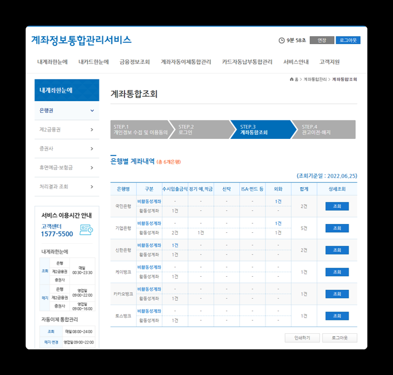 다만 종류가 다른 금융기관(은행, 증권, 휴면예금 등)은 한번에 조회할 수 없고, 종류가 같은 금융기관 (은행, 증권, 휴면예금 등) 만 통합하여 조회할 수 있습니다.