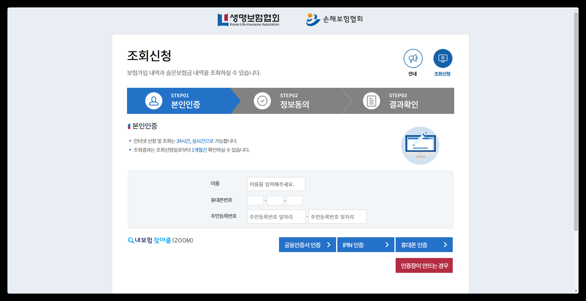 손해보험협회에서 운영하는 내 보험 찾아줌은 숨은 보험 찾기를 조회하는 이용자 본인의 보험가입내역을 통합하여 조회할 수 있는 사이트로 나의 보험 계약현황, 미청구 보험금, 만기 보험금 등을 확인할 수 있습니다.