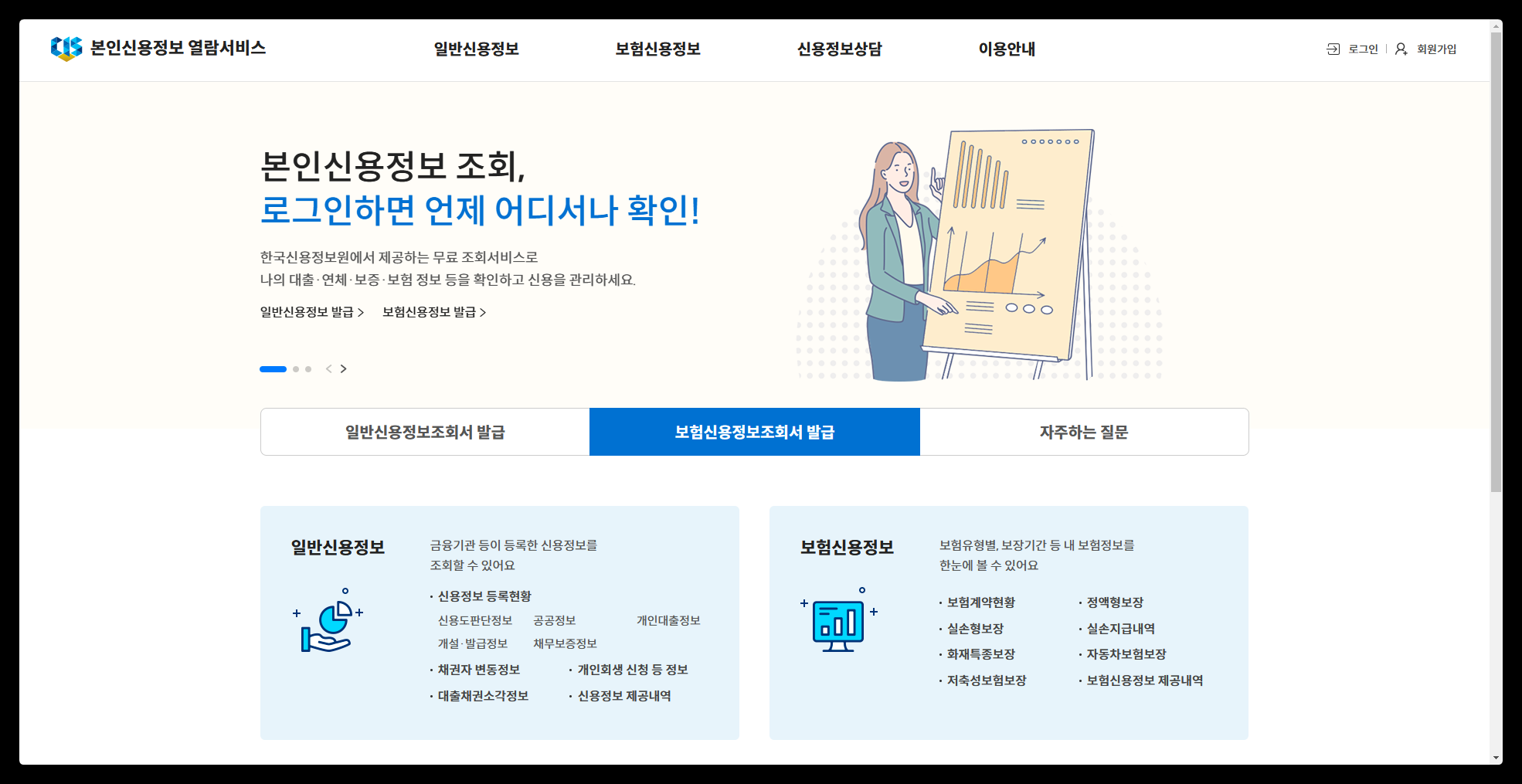 본인신용정보 열람서비스는 신용정보 공동전상망에 등록되어 있는 보험정보를 열람할 수 있는 있는 사이트로 자동차보험, 실손형 보험, 정액형 보험 등 보험계약정보를 통합하여 조회할 수 있습니다. 해당 사이트에서는 무료회원을 가입하고 로그인한 경우에는 이용가능합니다.