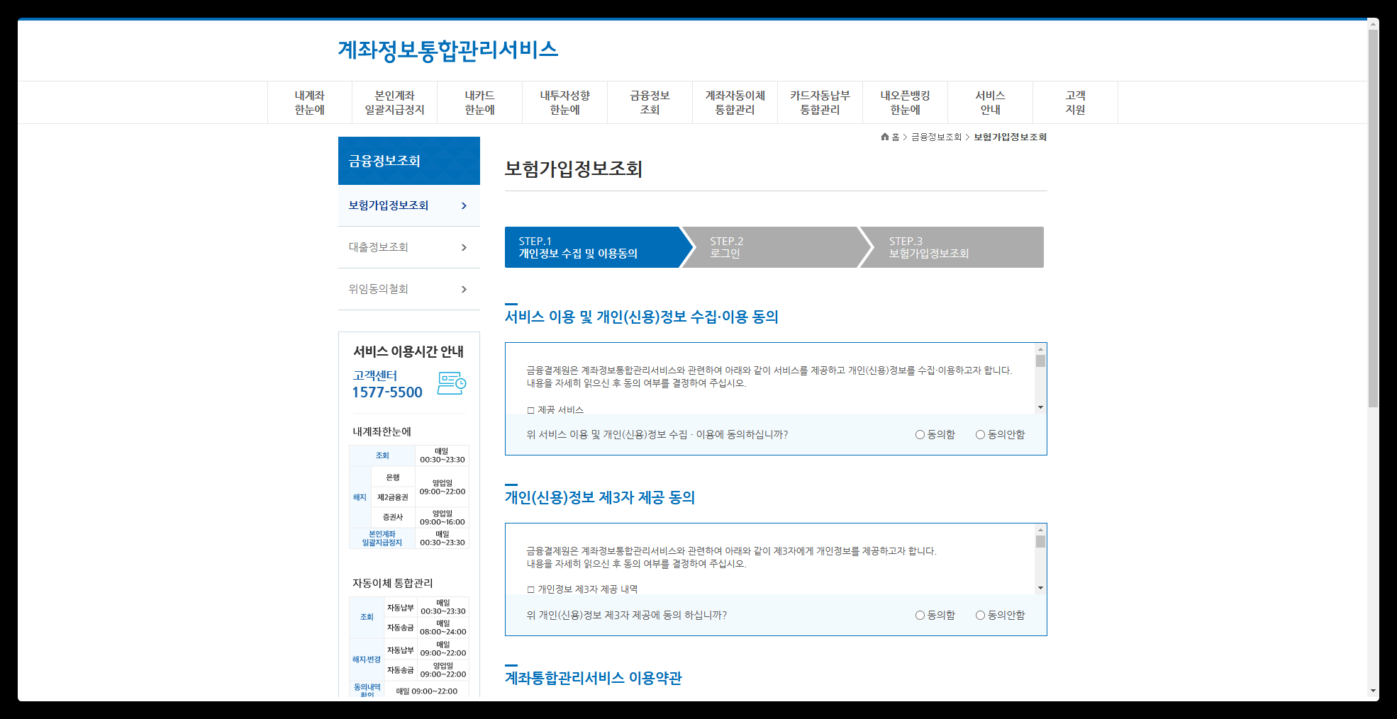 계좌정보통합관리서비스는 나의 금융재산을 조회하고 관리할 수 있는 툴을 제공하는 웹사이트로 금융정보조회의 보험가입내역 조회 메뉴로 이동하면 본인 명의 보험가입현황을 통합하여 조회할 수 있습니다. 다만 신용정보 열람서비스, 생명보험협회보다 보험조회범위가 좁은 편입니다.